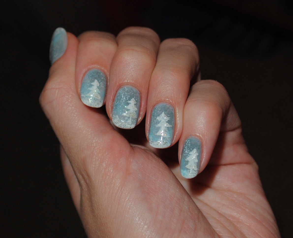 I started with one coat of white, then I sponged one half of the nail with second coat of white. After that I taped white half of the nail and sponged the other with grey. And finally I painted branches with the nail art brush. As I sponged second layer of polish, in the end the mani looked like a sort of fresco :)) And I decided to take a photo of them naked (without a top coat) first.